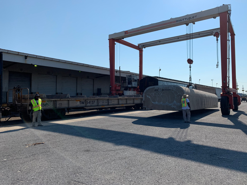 Below are images of the offloading of the steel coils, including the use of our Shuttle Lift (Straddle Crane) removing the covered gondola that protects the shipment from the weather and debris during the transportation process.